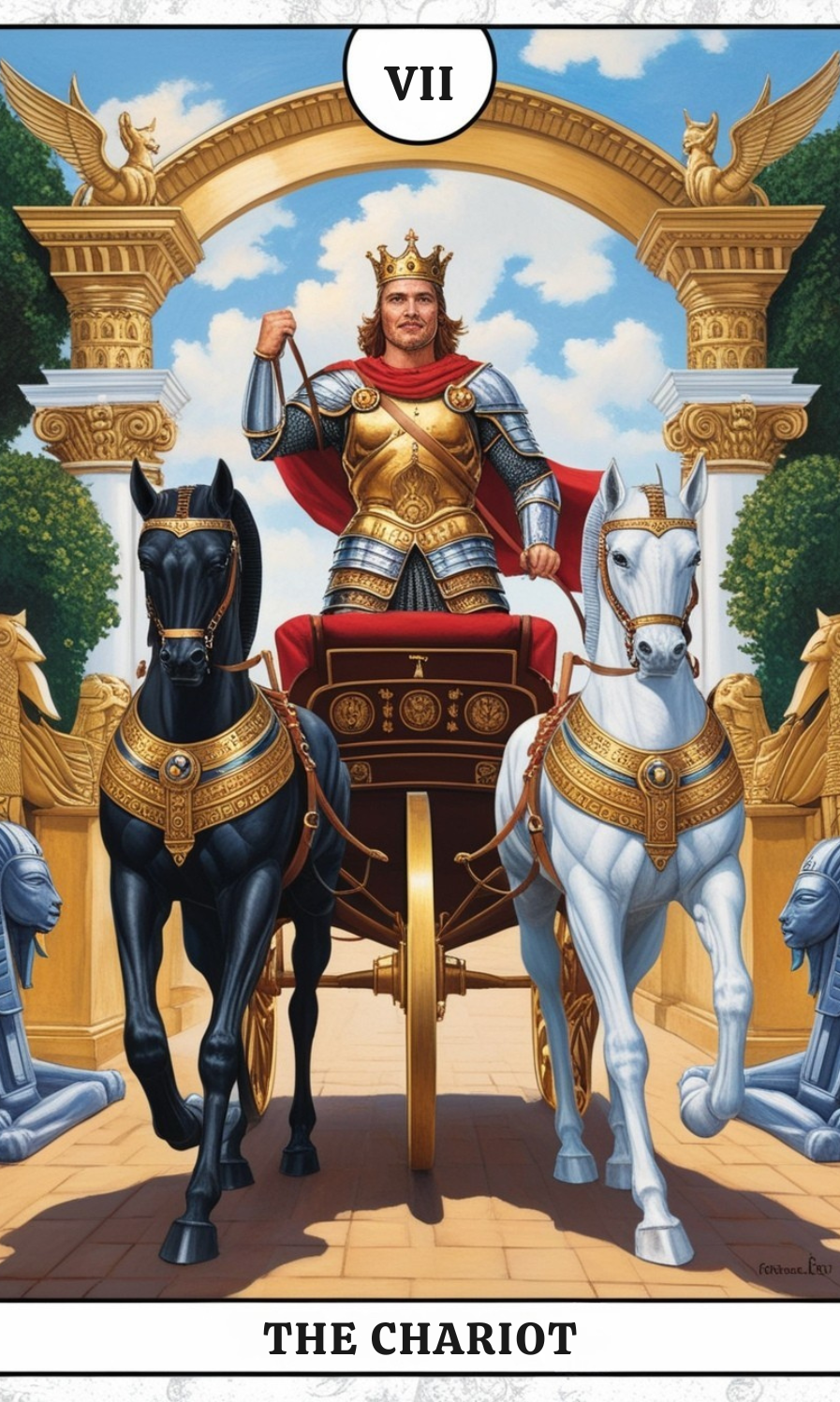 The Chariot (VII) shows a confident figure standing in a decorated chariot, pulled by two sphinxes or horses (often one black and one white). The charioteer wears armor and a crown, holding no reins - suggesting mastery through willpower rather than force. Symbols of authority and victory adorn the scene, while the opposing colored creatures represent conflicting forces that must be unified and directed.