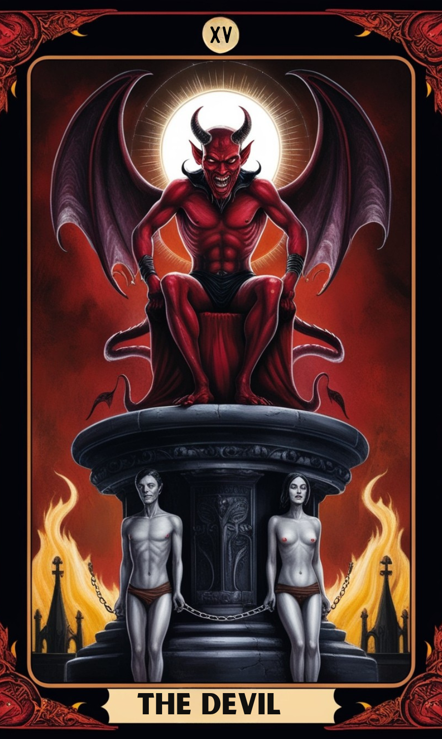 The Devil card represents the self-imposed bondage we create through our attachments, fears, and material desires. It reveals where we have given away our power and reminds us that the chains binding us are often of our own making. Whether in love, career, or personal life, the Devil encourages us to examine our dependencies and face our shadow aspects honestly. The card ultimately suggests that by recognizing our self-imposed limitations and finding the courage to break free from unhealthy patterns, we can reclaim our power and create more authentic, fulfilling lives.