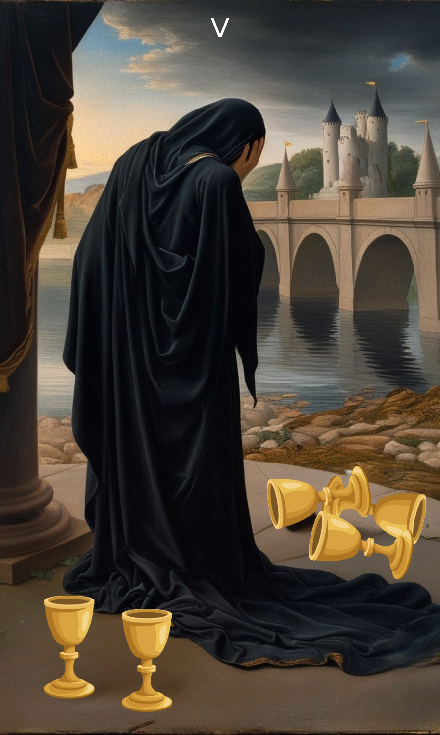 The Five of Cups depicts a figure draped in black, head bowed in grief, standing before three spilled cups while two full cups remain standing behind them. A bridge and castle are visible in the background, suggesting a path forward and potential shelter, though the figure seems too absorbed in their loss to notice these symbols of hope.