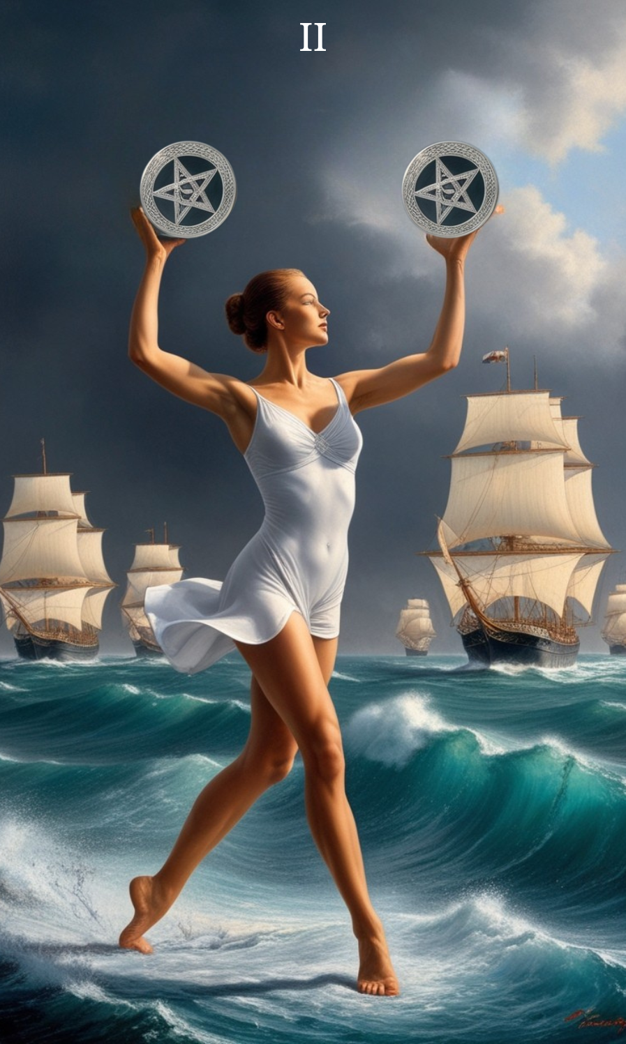 The Two of Pentacles represents balance, adaptability, and the art of juggling multiple responsibilities. Traditionally depicted as a figure dancing while juggling two pentacles connected by an infinity symbol, against a background of ships navigating choppy waters, this card embodies the dynamic nature of maintaining equilibrium in life's ever-changing circumstances.